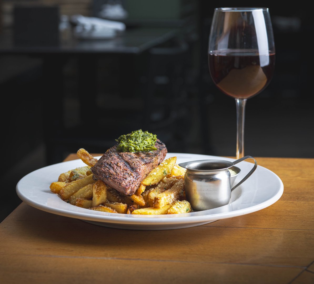 10oz New York striploin, garlic shrimp, mashed potatoes, seasonal vegetables
